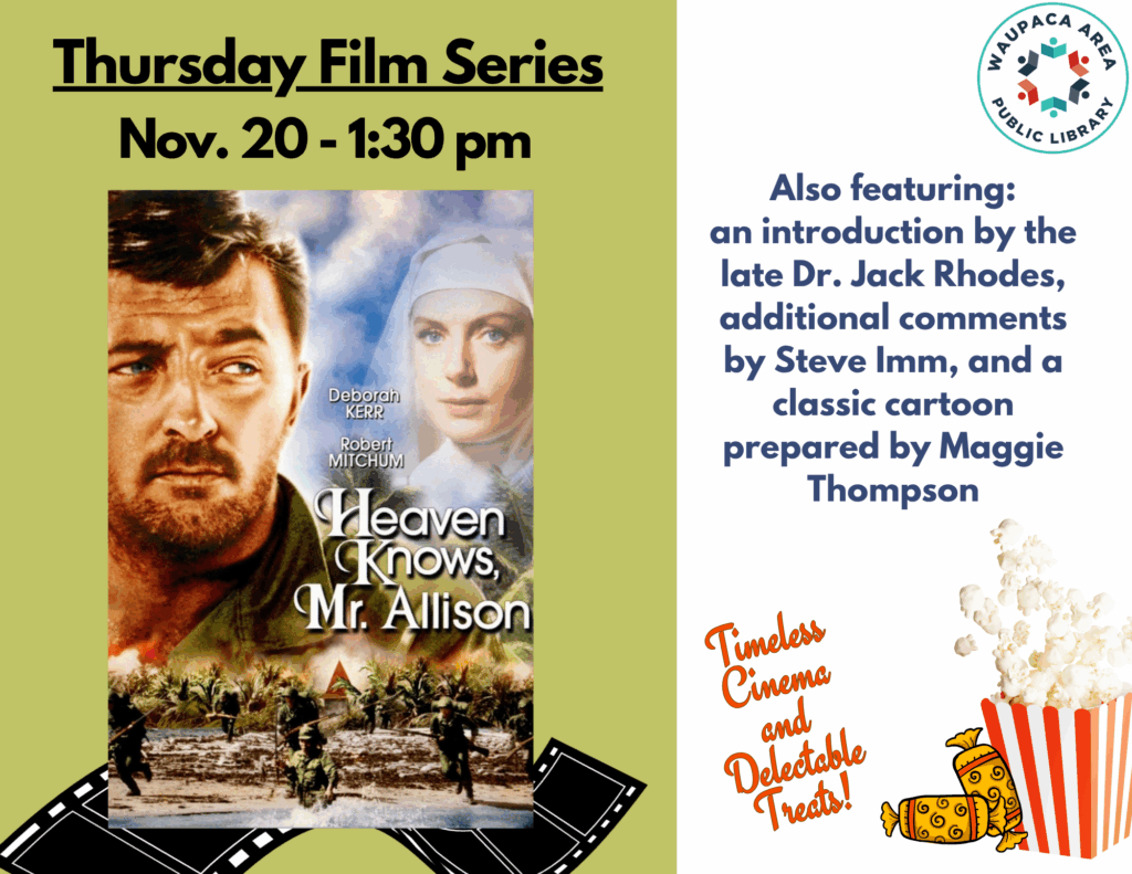 This month we will be watching “Heaven Knows, Mr. Allison” from 1957, starring Robert Mitchum and Deborah Kerr. A classic film with an introduction by the late Dr. Jack Rhodes. Our presentation will begin with a classic cartoon prepared by Maggie Thompson, and additional comments by Steve Imm.