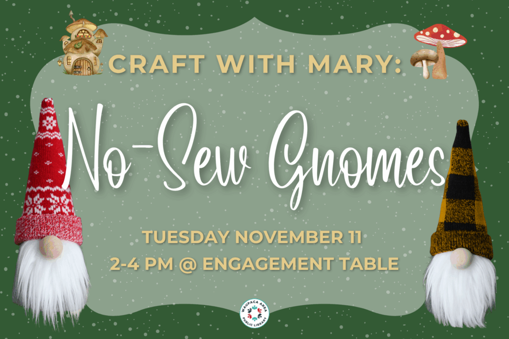 Join us at the engagement table for another crafting afternoon with Mary. This month we’re making no-sew gnomes, perfect for fall or winter! Drop-in any time between 2-4pm, can’t wait to see you there!
