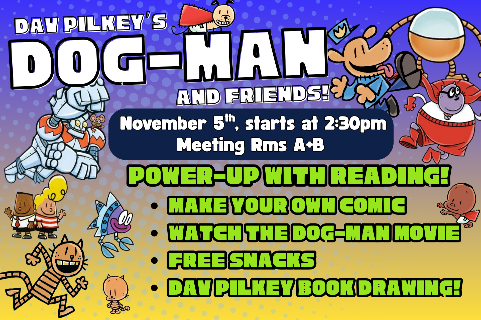 Join us in Meeting Rooms A + B on Wednesday Nov 5th for a Dog Man party! Make your own comics, poems and characters!