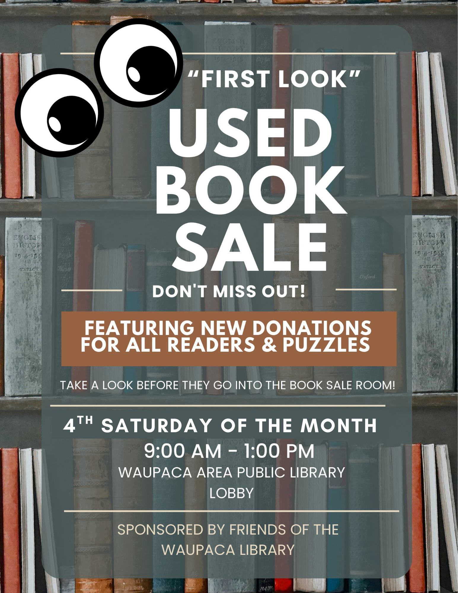 Join the Friends of the Waupaca Library for their “First Look” Used Book Sale! Look for this book sale each fourth Saturday in the lobby. Help us support the Friends of the Waupaca Library!