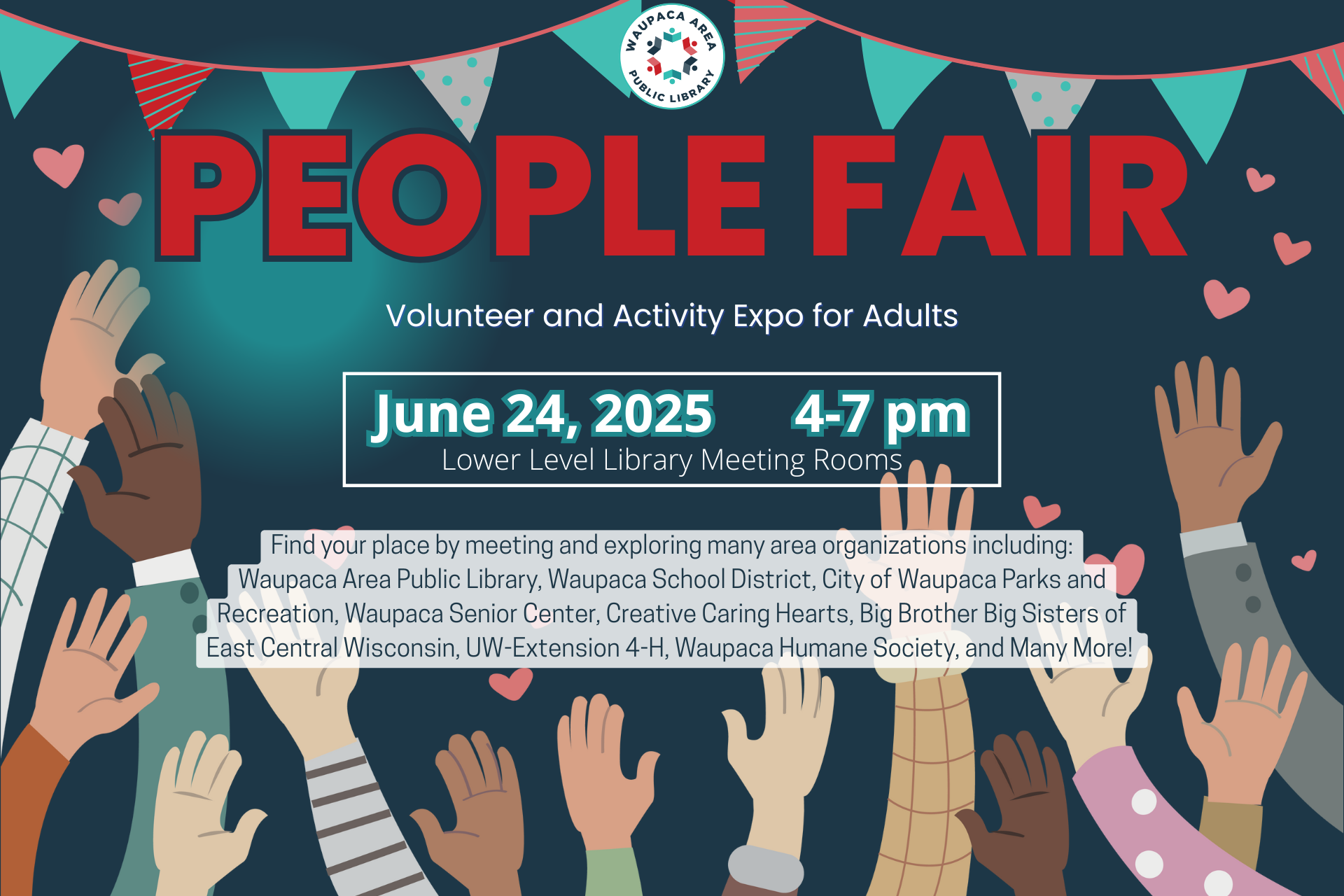 Waupaca Area Public Library, Waupaca School District, City of Waupaca Parks and Recreation, Waupaca Senior Center, Creative Caring Hearts, Big Brother Big Sisters of East Central Wisconsin, UW-Extension 4-H, Waupaca Humane Society, and Many More!