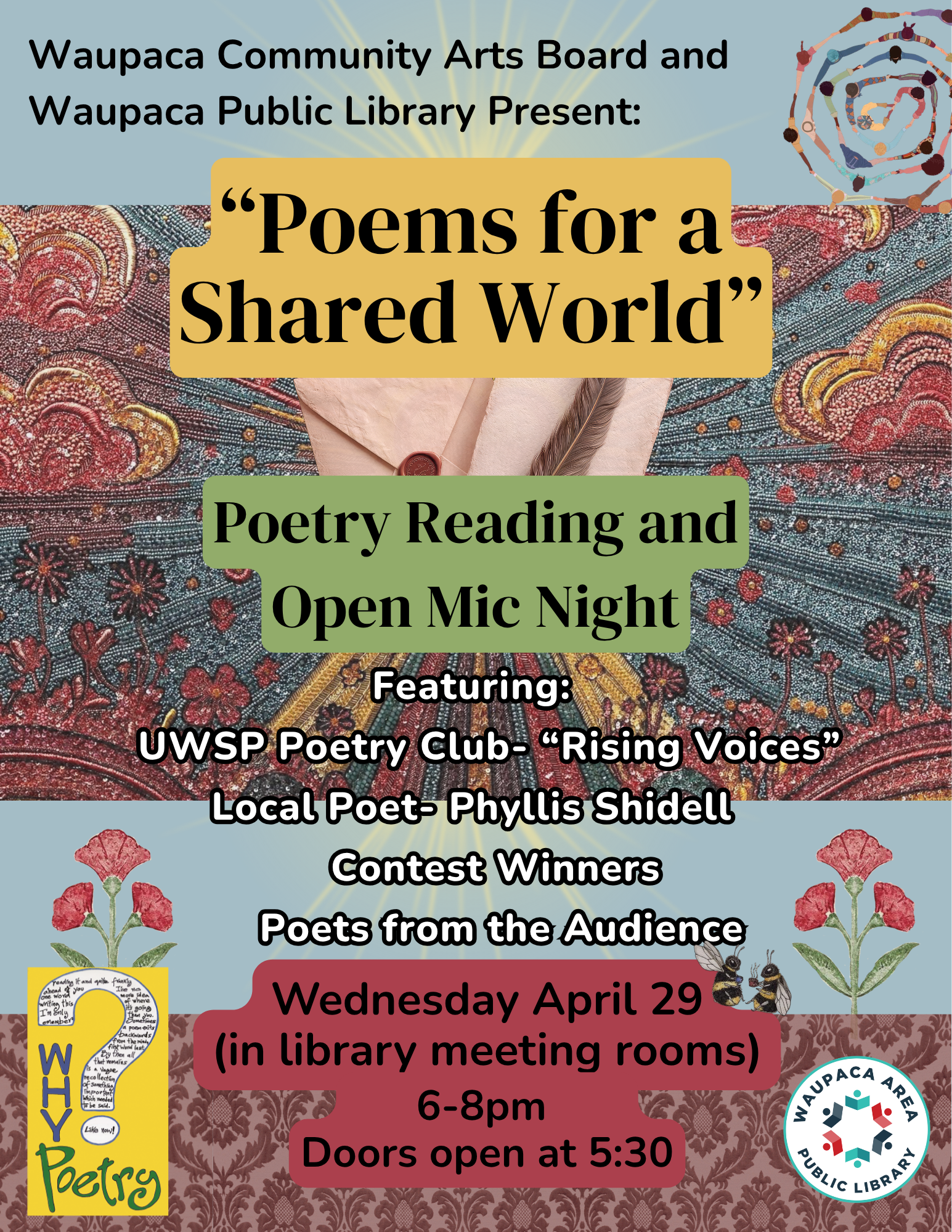 We are excited to feature local poet and previous contest winner, Phyllis Shidell, with a reading of her works. And UW Stevens Point Poetry Club, “Rising Voices” joins us again this year. The winners of our 2026 contest, “Poems for a Shared World” will be announced and invited to read their pieces. All are welcome to sign up for the open mic portion at the end of the evening.