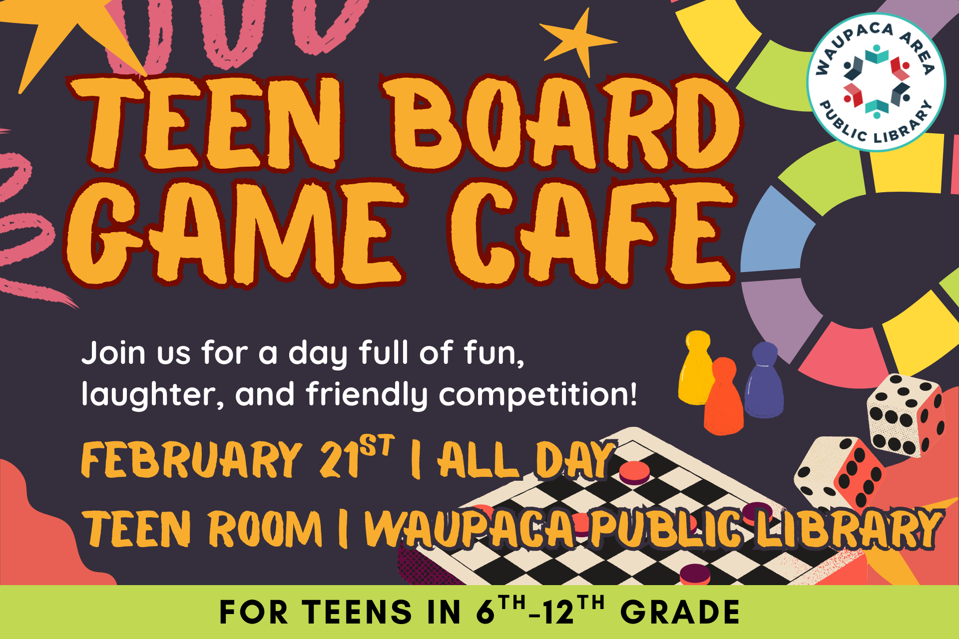 Enjoy playing games, and hanging out with friends in the Teen Room on Saturday, February 21st.