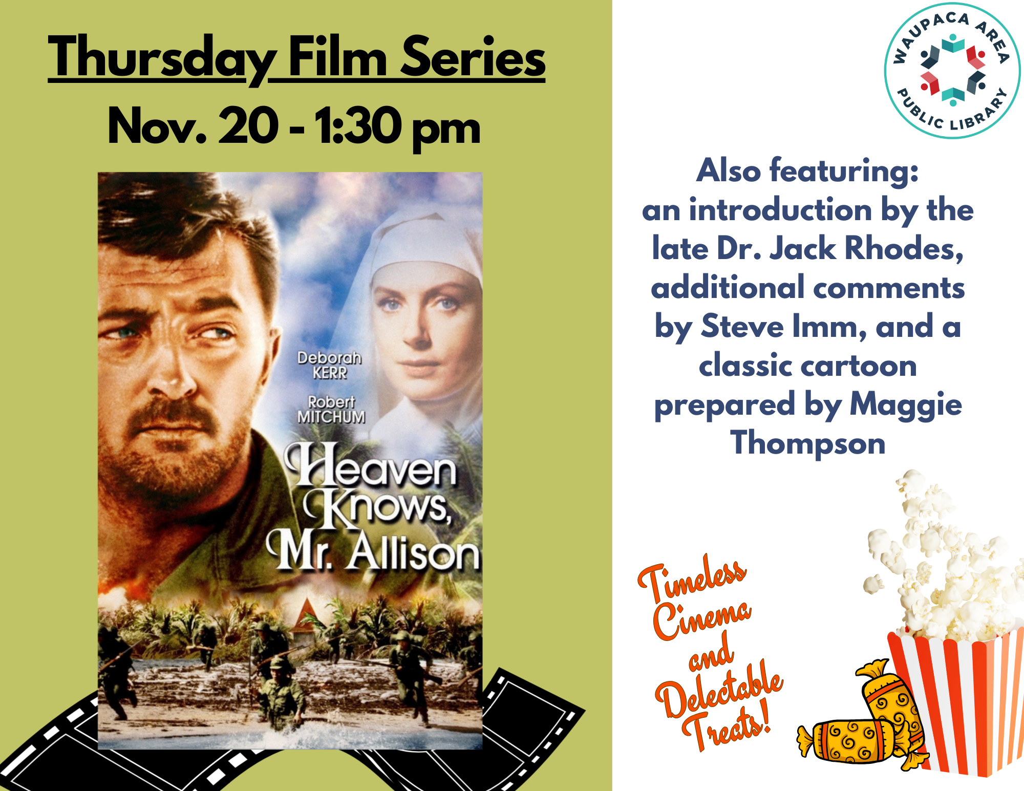 We will be watching “Heaven Knows, Mr. Allison” from 1957 starring Robert Mitchum and Deborah Kerr. A classic film with an introduction by the late Dr. Jack Rhodes. Our presentation will begin with a classic cartoon prepared by Maggie Thompson, and additional comments by Steve Imm, at 1:30pm.