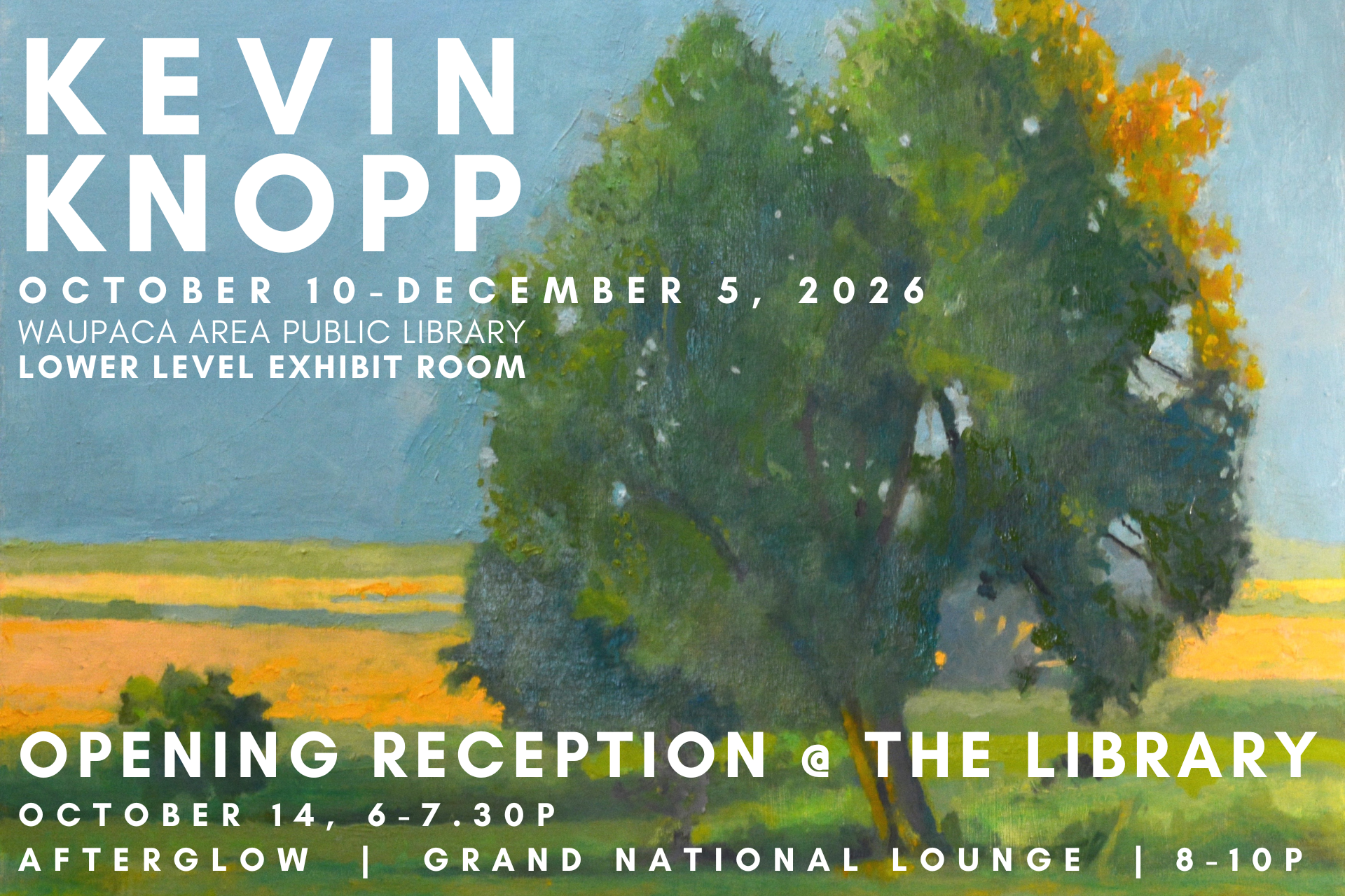 Mark your calendars! We are excited to feature artist Kevin Knopp in the Exhibit Room this fall. All are welcome at the opening reception in the Exhibit Room, 6-7.30p. Join us for an Afterglow at the Grand National Lounge, 8-10p featuring music by 3 Clowns/No Circus.