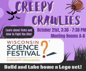 Library Events Grid View | Calendar View 01 October - 15 November 8:00 am - 6:00 pm AdultKids and FamilyTeen Dia de Muertos – Community Ofrenda 01 - 31 October 9:00 am - 6:00 pm Teen Teen Scary Story Writing Contest (6th-12th Grade) 18 October - 06 December All Day AdultExhibit World War I: Lessons and Legacies Exhibit 20 - 25 October 9:00 am - 2:00 pm Kids and Family Science in a Bag – Wisconsin Science Festival 21 October 3:30 pm - 7:30 pm Kids and Family Wisconsin Science Festival – Creepy Crawlies 22 October 10:00 am - 11:00 am Kids and Family Story Time 22 October 3:00 pm - 5:00 pm Teen Teen Dungeons and Dragons One-Shot (Registration Required) 23 October 4:00 pm - 5:00 pm AdultTeen ¿Cómo se dice?/ How do you say? 23 October 4:00 pm - 5:00 pm Teen Teen Dungeon Rangers (Teen-Led): Dungeon Master Bootcamp 24 October 10:00 am - 11:00 am Kids and Family Babygarten 24 October 4:00 pm - 5:30 pm Teen Teen Crochet Club 24 October 4:00 pm - 6:00 pm AdultKids and FamilyTeen Halloween on Main No event found! Load More