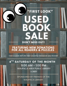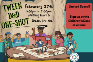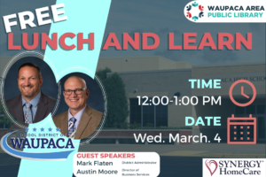 Library Events Grid View | Calendar View 12 January - 28 March 9:00 am - 2:00 pm AdultExhibitKids and FamilyTeen Mini Art Show 02 - 28 February All Day Teen Teen Drop-In Craft: Teen Zines 07 February - 28 March All Day AdultExhibitKids and FamilyTeen Youth Art Month Exhibit 27 February 10:00 am - 11:00 am Kids and Family Babygarten 27 February 3:30 pm - 5:30 pm Kids and Family Tween D&D One Shot 28 February 9:00 am - 2:00 pm AdultKids and FamilyTeen First Look Book Sale 28 February 1:00 pm - 2:00 pm Teen Teen Book Club 03 March 4:00 pm - 5:00 pm Teen T.V.A (Teen Volunteer and Advisory Agents) Meeting 03 March 5:30 pm - 7:00 pm AdultTeen Financial Wellness 04 March 10:00 am - 11:00 am Kids and Family Story Time 04 March 12:00 pm - 1:00 pm Adult Lunch and Learn: Waupaca School District 04 March 2:30 pm - 4:00 pm Kids and Family Afterschool Wednesday Activity No event found! Load More