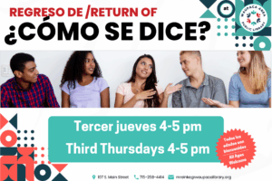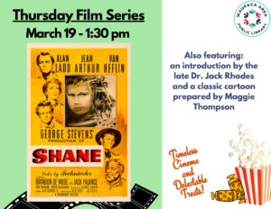 Library Events Grid View | Calendar View 12 January - 28 March 9:00 am - 2:00 pm AdultExhibitKids and FamilyTeen Mini Art Show 07 February - 28 March All Day AdultExhibitKids and FamilyTeen Youth Art Month Exhibit 19 March 1:30 pm - 3:30 pm Adult Thursday Film Series: Shane 19 March 4:00 pm - 5:00 pm Adult ¿Comó se dice? 19 March 6:30 pm - 7:00 pm Kids and Family Sleepyhead Storytime 20 March 10:00 am - 11:00 am Kids and Family Babygarten 20 March 3:30 pm - 5:30 pm Kids and Family Tween D&D One Shot 20 March 4:00 pm - 5:00 pm Teen Teen Suminagashi, Japanese Paper Marbling 21 March 10:00 am - 11:00 am AdultBook Discussion Book Club: House in the Cerulean Sea 25 March 10:00 am - 11:00 am Kids and Family Story Time 25 March 2:30 pm - 4:00 pm Kids and Family Afterschool Wednesday Activity 27 March 10:00 am - 11:00 am Kids and Family Babygarten No event found! Load More