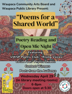 Library Events Grid View | Calendar View 04 April - 30 May All Day AdultExhibit AgriCULTURE: Celebrating Waupaca’s Rich Farming History 28 April 3:00 pm - 5:30 pm AdultKids and FamilyTeen Citizen Science – Penguin Palooza 29 April 10:00 am - 11:00 am Kids and Family Story Time 29 April 6:00 pm - 8:00 pm AdultKids and Family Poetry Read and Open Mic Night 30 April 5:30 pm - 7:30 pm AdultTeen Seed Saving 101+ with Angie Peterson 01 May 10:00 am - 11:00 am Kids and Family Babygarten 01 May 3:30 pm - 5:30 pm Kids and Family Tween D&D One Shot – Group B 04 May 4:00 pm - 5:00 pm Teen Teens Positively Chalk It Up! 05 May 3:30 pm - 5:00 pm Kids and FamilyTeen Kids’ LEGO Club 05 May 4:00 pm - 5:00 pm Teen T.V.A (Teen Volunteer and Advisory Agents) Meeting 06 May 12:00 pm - 1:00 pm Adult Lunch and Learn: Breanne Yeska-History of Indian Crossing Casino 08 May 10:00 am - 11:00 am Kids and Family Babygarten No event found! Load More