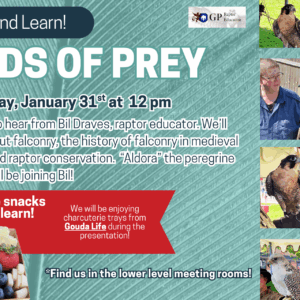Inspired by our monthly Lunch and Learn program, comes Saturday Snack and Learn! Come learn all about falconry and raptor conservation with Bill Draves and a real peregrine falcon. We will be enjoying charcuterie boards from the downtown business “Gouda Life” while we learn, so bring a friend! *No registration required