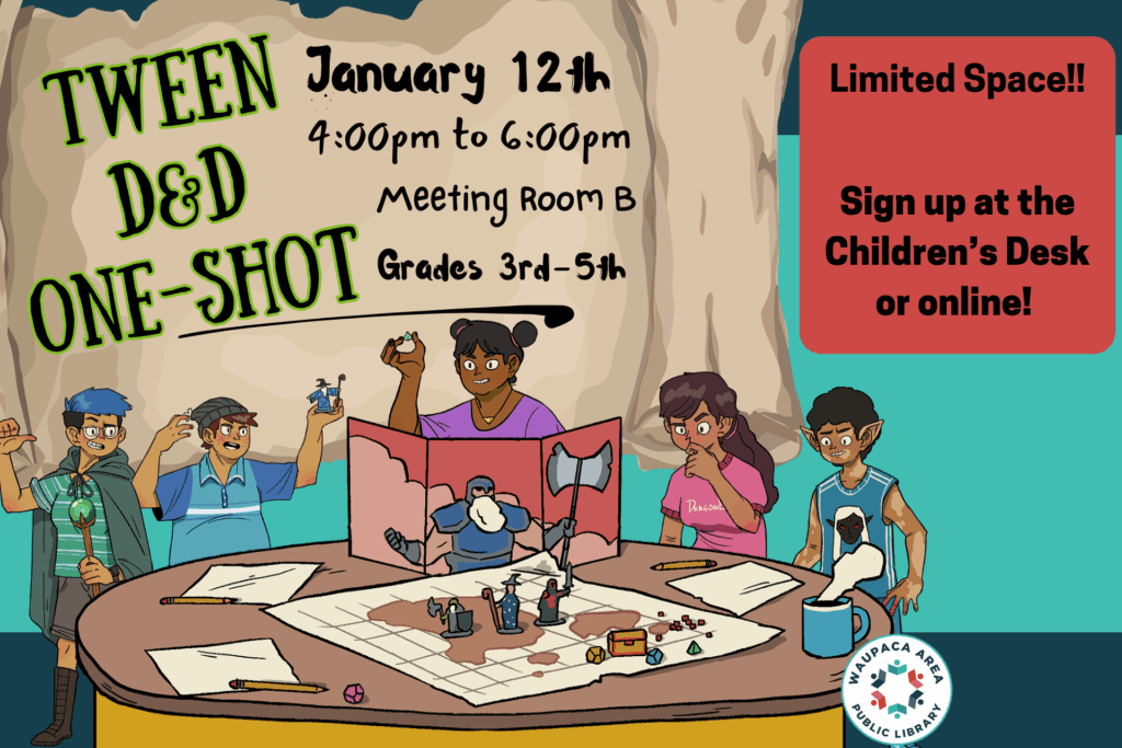Adventure returns with Tween D&D! For grades 3rd-5th. What mysteries and adventure await in the lands of Moonsea? What heroes will brave the dangers to discover hidden history, untold riches and unattained glory? Join us from 4:00pm to 6:00pm in Meeting Room B on December 15th for action, dangers and excitement! Characters and dice provided. […]