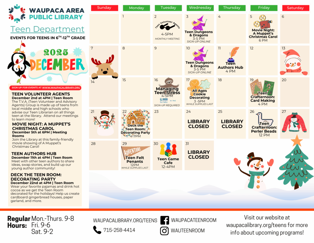 The Teen Room is a space built, maintained and used by teens. All students, grades 6-12 are welcome to use the services provided in the Teen Room and to participate in teen programs sponsored by the Waupaca Area Public Library and our Teen Volunteer Agents (TVA).
